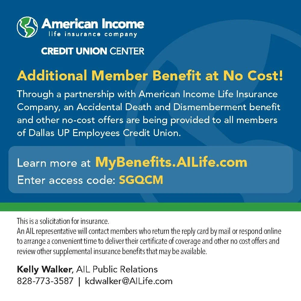 We have partnered with AIL Life Insurance company for our $2,500 AD&D coverage. This coverage is free to all members in good standing. You will be receiving a letter in the mail soon. With the letter will be a card for you to list a beneficiary for your AD&D coverage and request more information on AIL’s other insurance products.